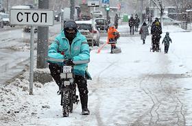 Жанровая фотография. Снегопад в городе. Курьер службы доставки OZON на электровелосипеде на улице…