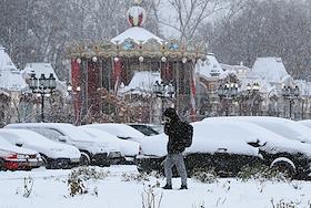 Жанровая фотография. Снегопад в городе. Заснеженные припаркованные автомобили на стоянке и детская…