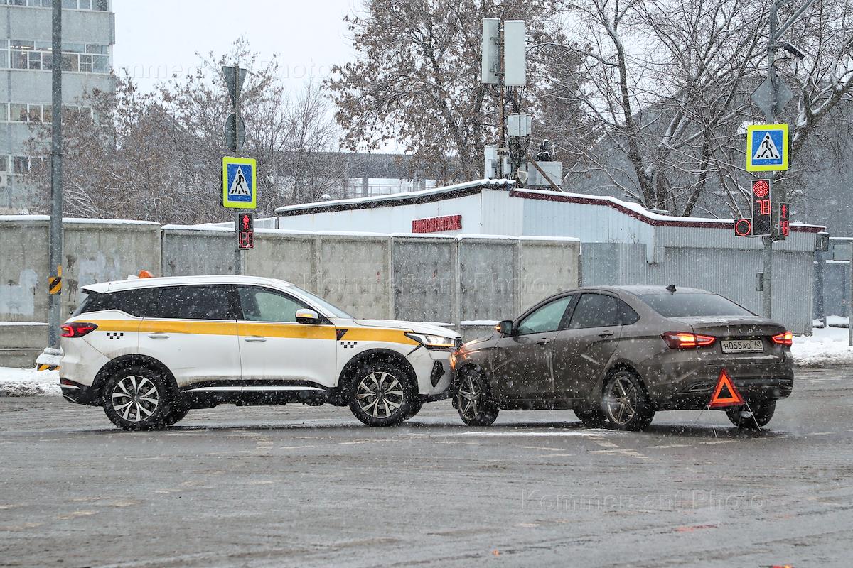 Жанровая фотография. Снегопад в городе. Автомобильная авария на дороге с участием такси .