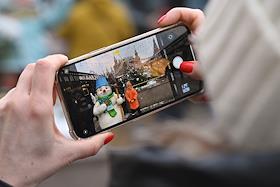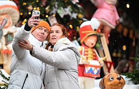 Жанровая фотография. Город елочных игрушек на Площади революции. Туристы фотографируются у фигуры…