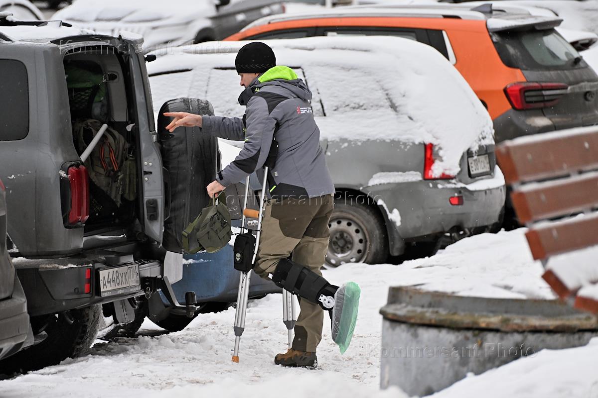 Жанровая фотография. Мужчина с травмированной ногой у автомобиля на парковке.