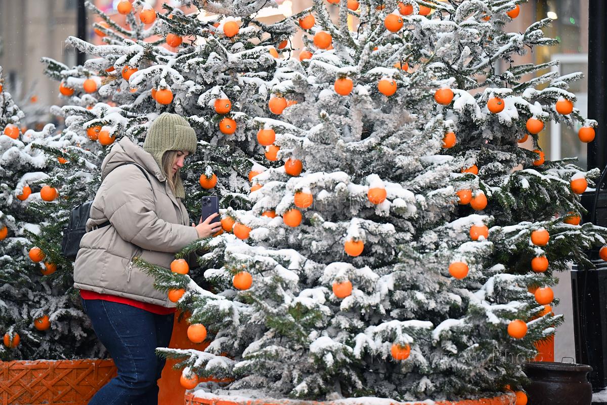 Виды предновогодней Москвы. Жанровая фотография. Елка, украшенная мандаринами, на Арбате.
