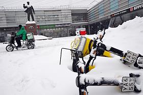 Виды Москвы во время снегопада. Жанровая фотография. Электровелосипеды курьерской службы доставки…