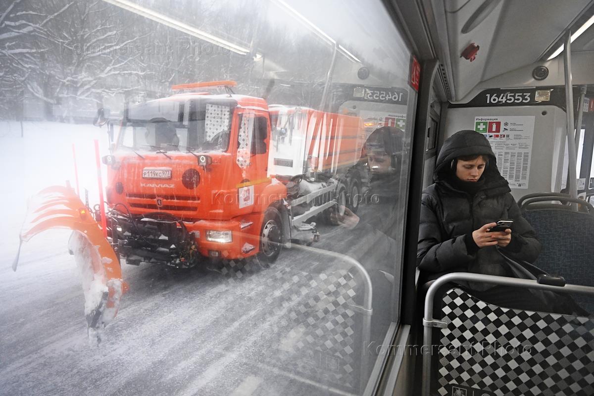 Виды Москвы во время снегопада. Жанровая фотография. Пассажир в салоне автобуса.