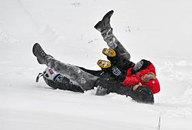 Виды Москвы во время снегопада. Жанровая фотография. Мужчина с ребенком катаются с горы на тюбинге.