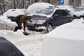 Виды Москвы во время снегопада. Жанровая фотография. Водитель чистит от снега автомобиль.