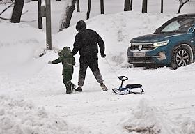 Виды Москвы во время снегопада. Жанровая фотография. Папа с ребенком везет санки.