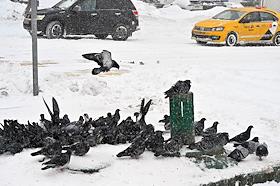 Виды Москвы во время снегопада. Жанровая фотография. Стая голубей на снегу.