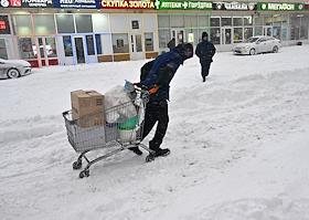 Виды Москвы во время снегопада. Жанровая фотография. мужчина с коробками в покупательской тележке.