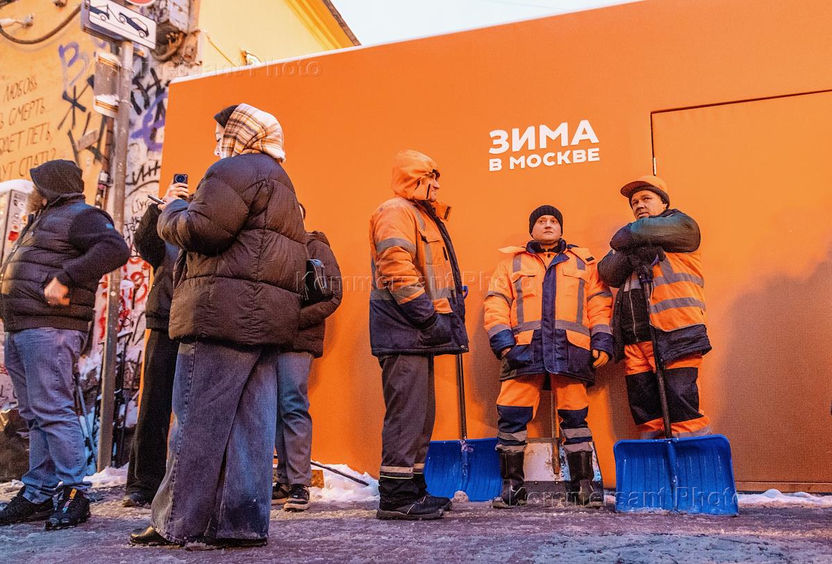 Виды новогодней Москвы. Жанровая фотография. Рабочие у площадки фестиваля "Зима в Москве" на Арбате.
