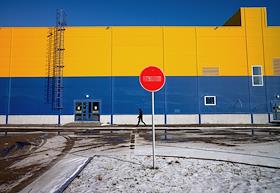 Виды города Волжский. Жанровая фотография. Дорожный знак "Въезд запрещен" на подъезде к продуктовому…
