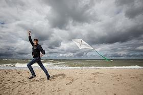 Национальный парк "Куршская коса". Жанровая фотография. Мальчик запускает воздушного змея на берегу…