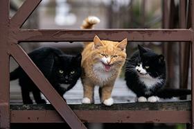 Жанровая фотография. Эко-ферма "Ваньково" в деревне Сивково. Рыжий и черные коты играют у дома.