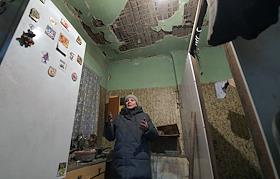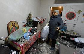 Последствия обстрела жилых частных домов в Куйбышевском районе Донецка. Люди в разрушенной комнате.