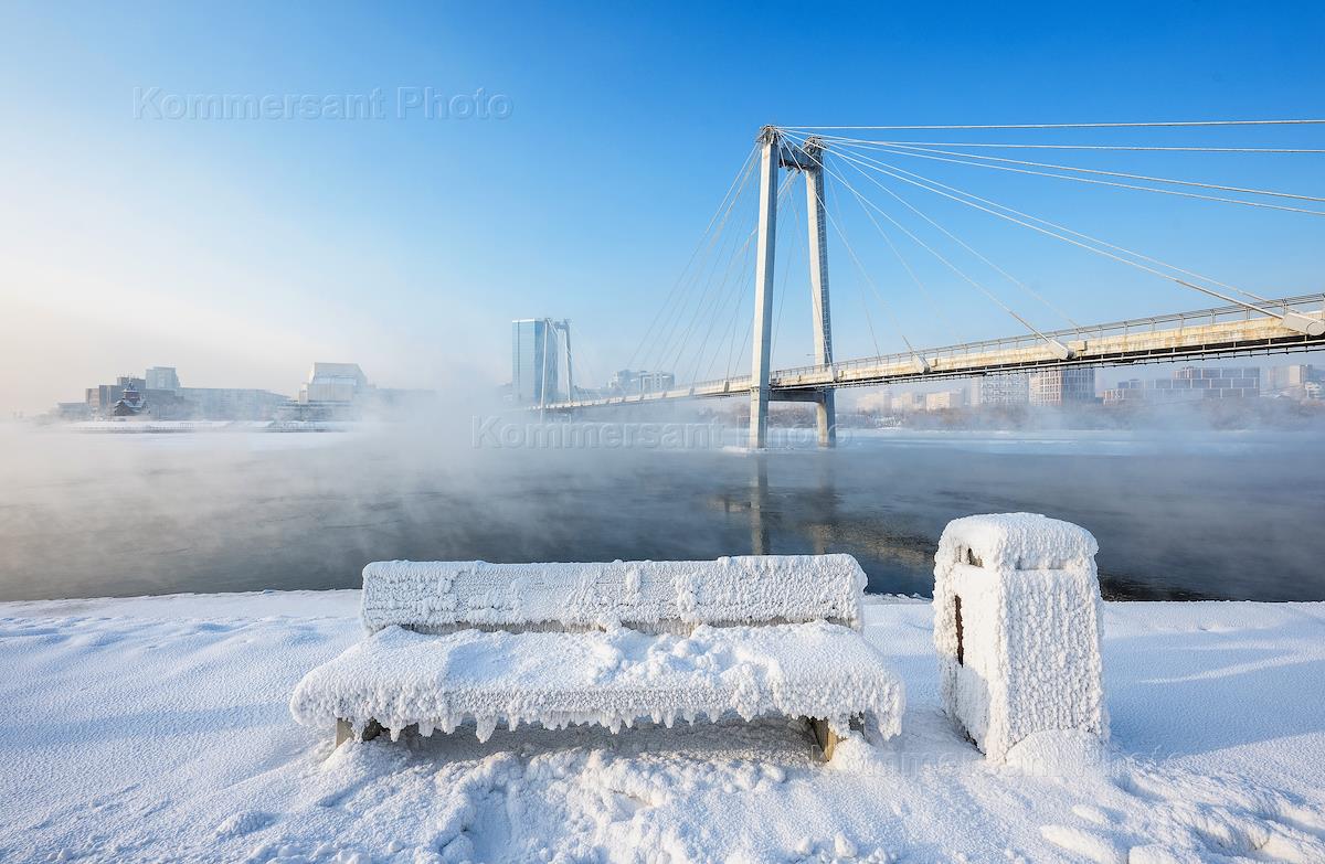 Виды Красноярска во время аномальных морозов. Жанровая фотография. Виноградовский мост через реку…