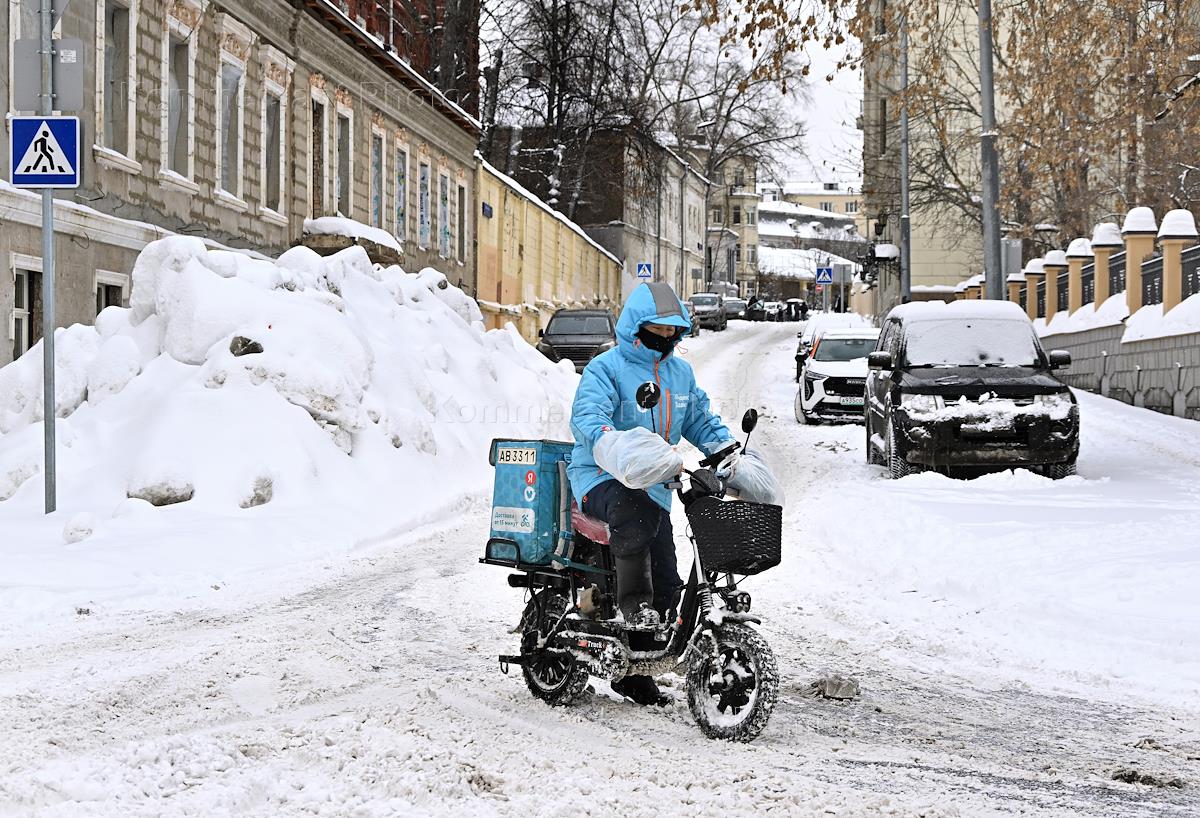 Виды Москвы. Жанровая фотография. Снегопад в городе. Курьер компании "Яндекс Лавка" на Сретенском…