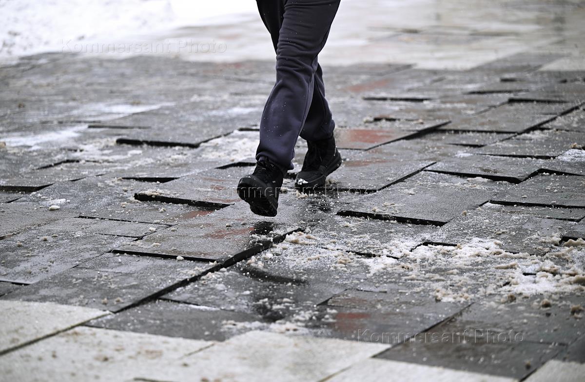 Виды Москвы после снегопада. Жанровая фотография. Мешок с противогололедным материалом стоит на…