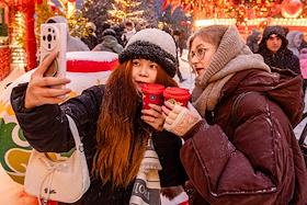 Церемония открытия фестиваля "Китайский Новый год в Москве" на Манежной площади. Китайские туристки…