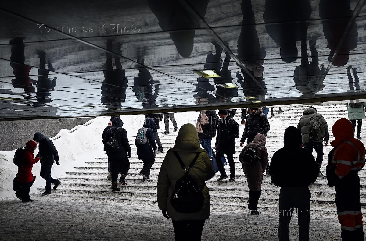 Жанровая фотография. Снегопад в городе. Люди в подземном переходе.