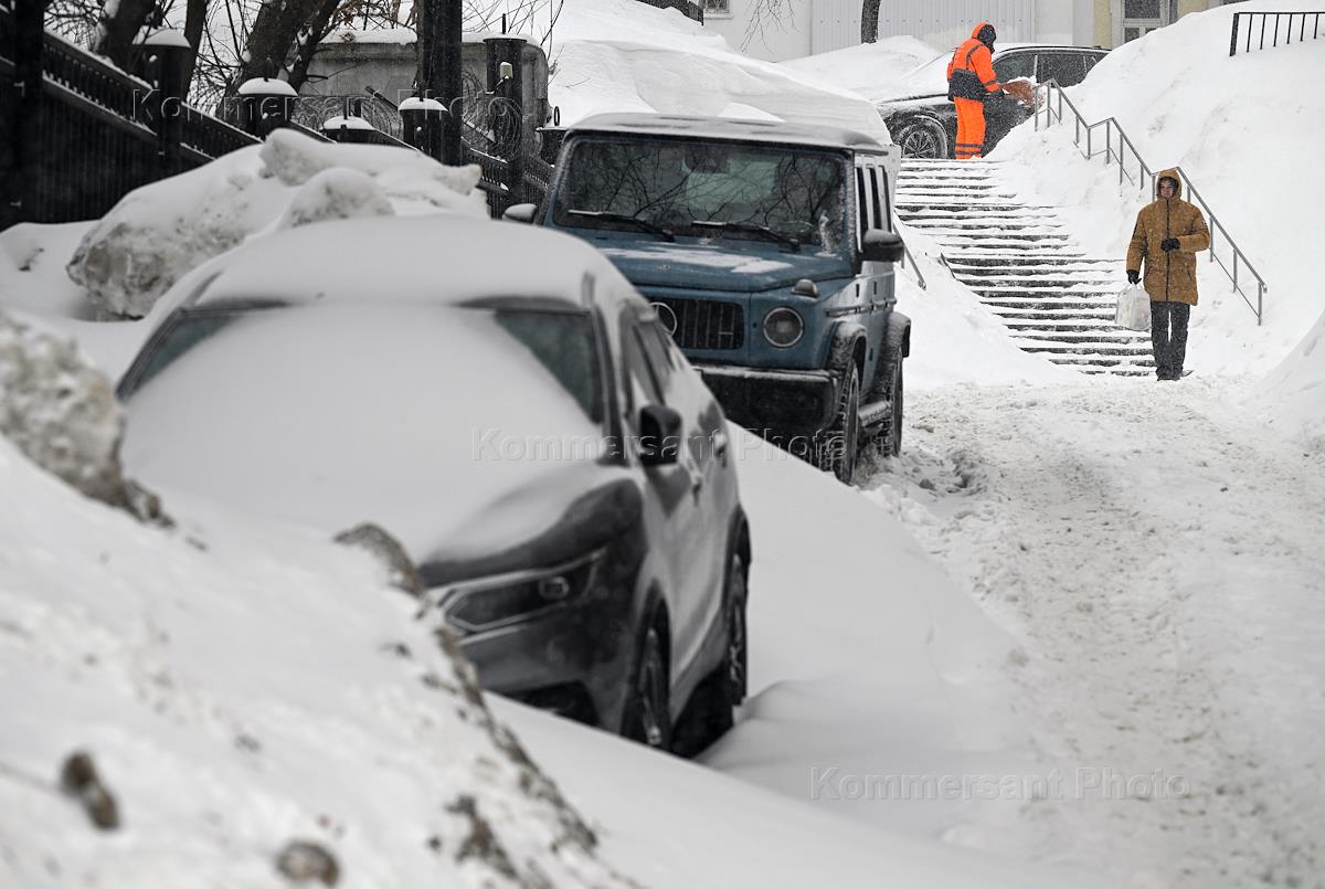 Жанровая фотография. Снегопад в городе. Заснеженные припаркованный автомобили на улице.