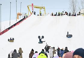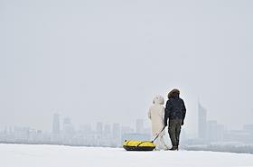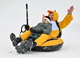 Фестиваль "Сани" от "Московских сезонов" в Крылатском. Жанровая фотография. Люди с ватрушкой стоят…