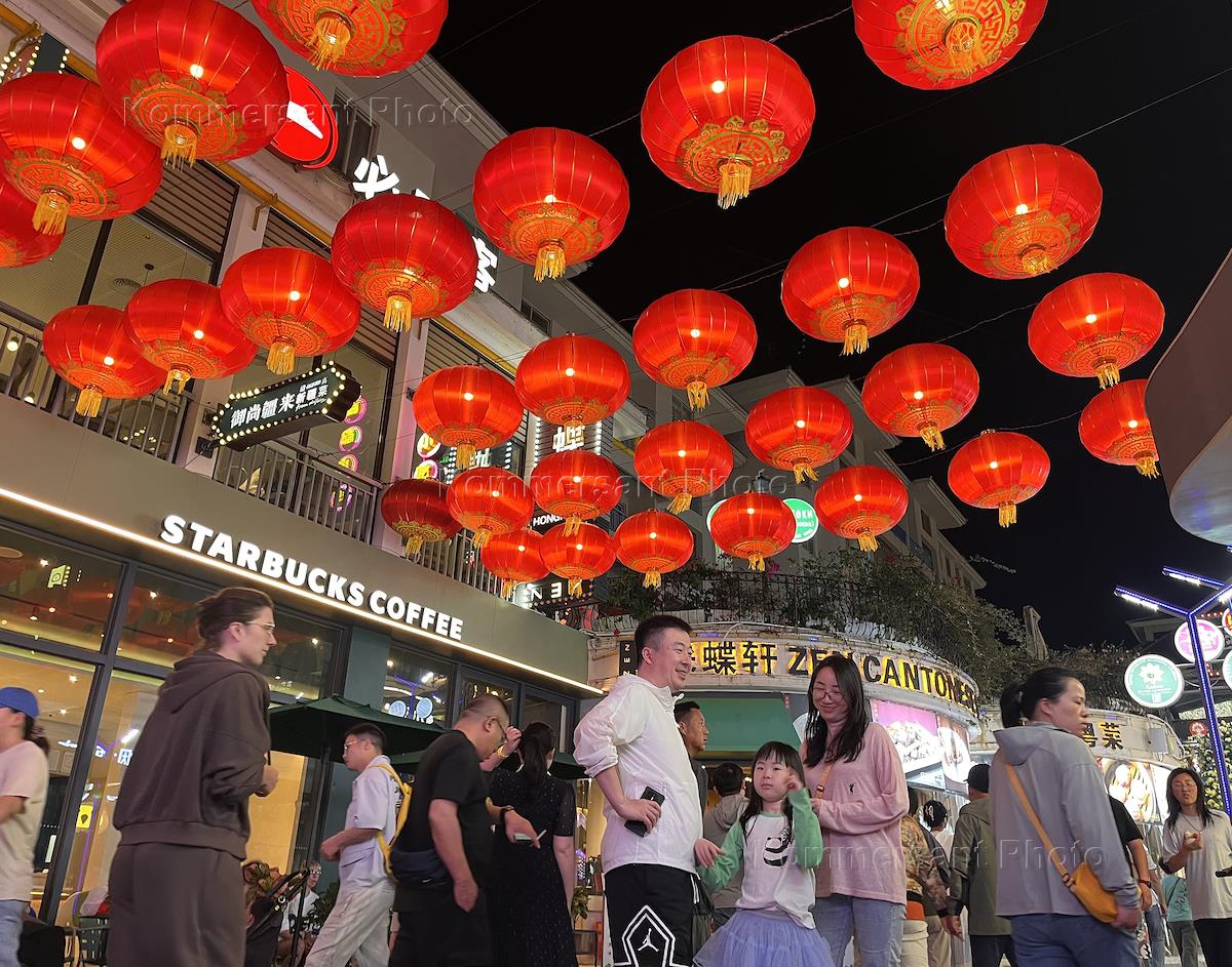 Виды города Саньи. Жанровая фотография. Пешеходная улица с ресторанами и торговыми помещениями.