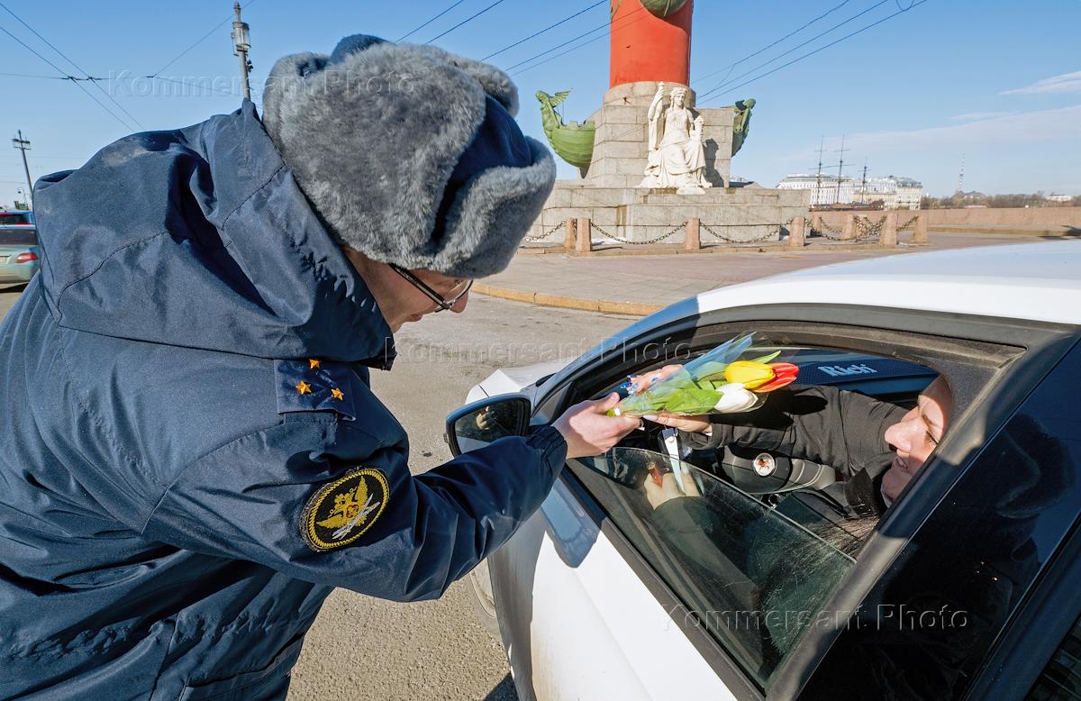 Поздравление сотрудниками ГИБДД женщин-водителей с Международным женским днем (8 марта) в Санкт-Петербурге.