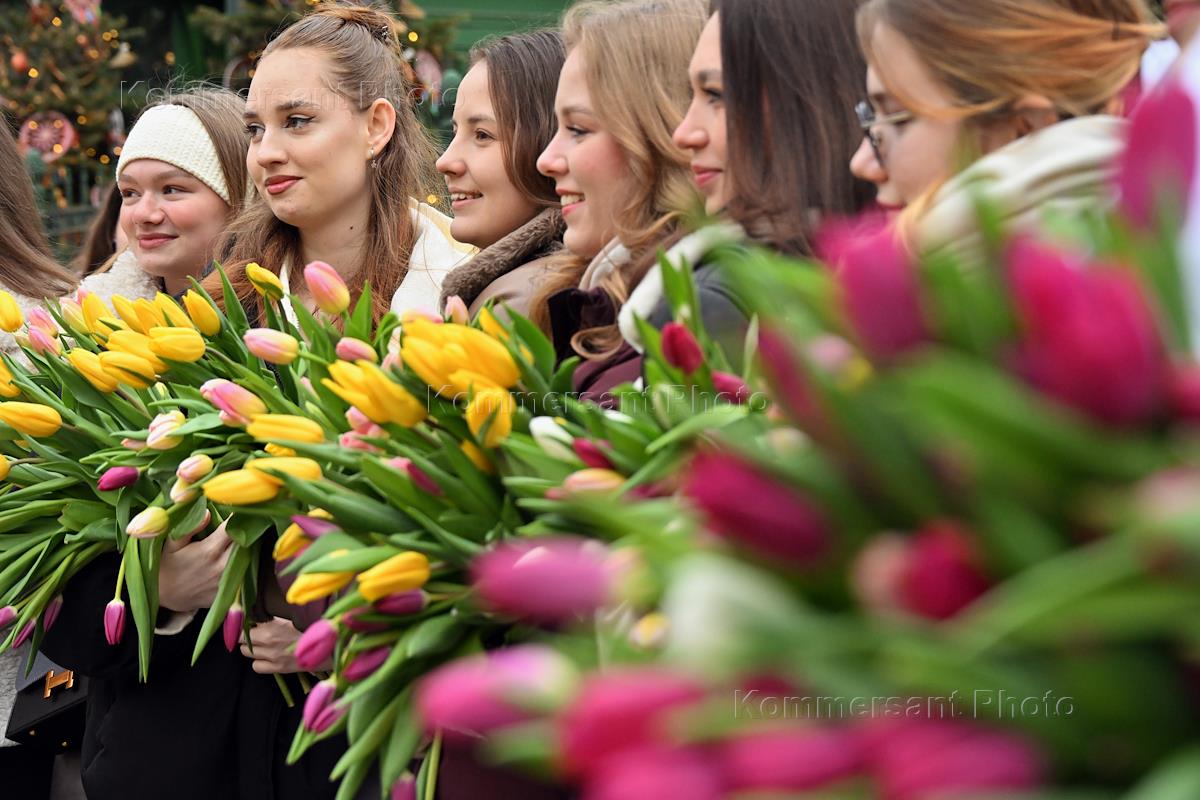 Празднование Международного женского дня на улицах города. Жанровая фотография. Девушки с букетами…