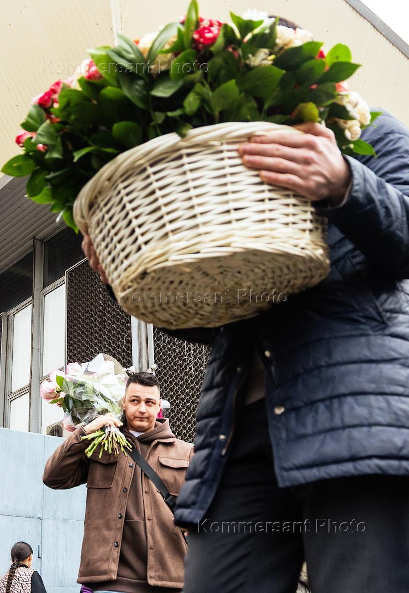 Продажа цветов на Рижском рынке в преддверии Международного женского дня 8 марта. Жанровая…