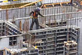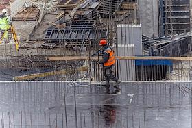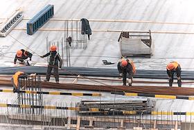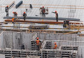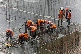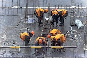 Жанровая фотография. Рабочие вяжут арматуру на строительстве многоэтажного жилого дома.