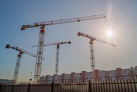 Жанровая фотография. Строительные краны на строительной площадке многоэтажного жилого дома.