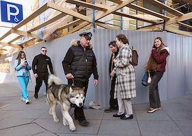 Виды Санкт-Петербурга. Жанровая фотография. Мужчина с собакой-маламутом во время прогулки на Невском…
