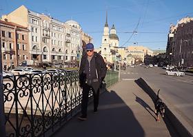 Виды Санкт-Петербурга. Жанровая фотография. Мужчина во время прогулки с собакой.