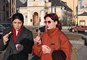Виды Санкт-Петербурга. Жанровая фотография. Девушки едят мороженое во время прогулки в центре города.