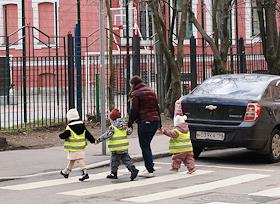 Виды Санкт-Петербурга. Жанровая фотография. Женщина с детьми в светоотражающих жилетах переходит…