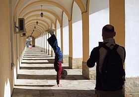 Виды Санкт-Петербурга. Жанровая фотография. Молодой человек делает стойку на руках во время…