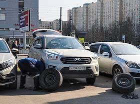 Виды Санкт-Петербурга. Жанровая фотография. Мужчина меняет колеса автомобиля на парковке в районе…