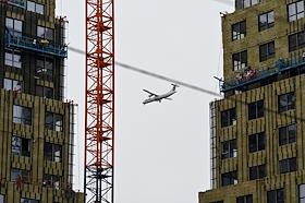 Виды Омска. Жанровая фотография. Самолет в небе между строящимися многоэтажными жилыми домами.