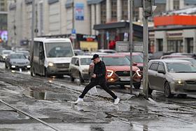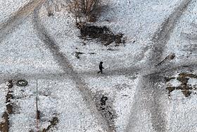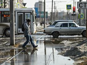 Виды Омска. Жанровая фотография. Мужчина на затопленном талыми водами наземном пешеходном переходе.