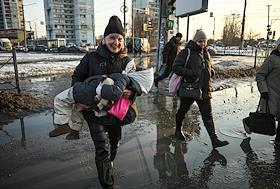 Виды Омска. Жанровая фотография. Женщина с ребенком на руках на затопленном талыми водами наземном…