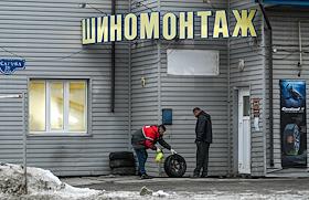 Виды Омска. Жанровая фотография. Сотрудник мастерской "Шиномонтаж" во время работы.