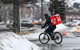 Виды Омска. Жанровая фотография. Курьер службы доставки еды "Яндекс Еда" на велосипеде переезжает…