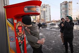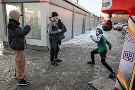 Виды Омска. Жанровая фотография. Молодые люди возле уличного аттракциона "Силомер боксер".