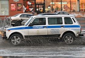 Виды Омска. Жанровая фотография. Автомобиль полиции во время движения по городской улице.