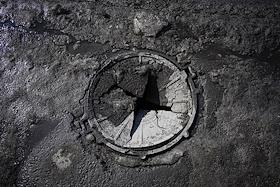 Жанровая фотография. Треснувший металлический люк канализации на дороге.