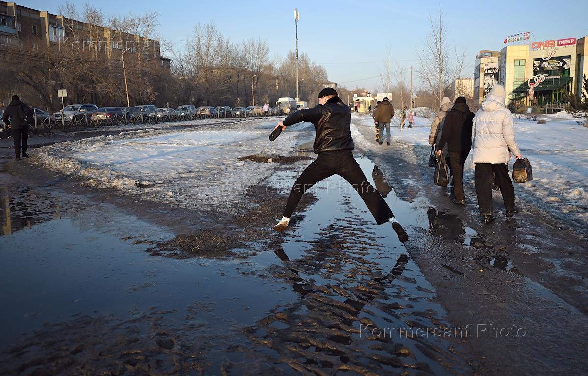 Виды Омска. Жанровая фотография. Молодой человек перепрыгивает через лужу.