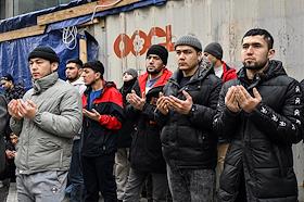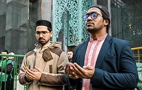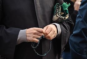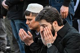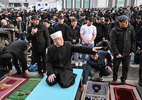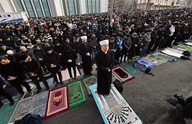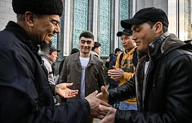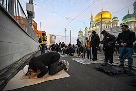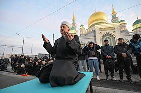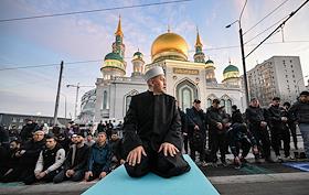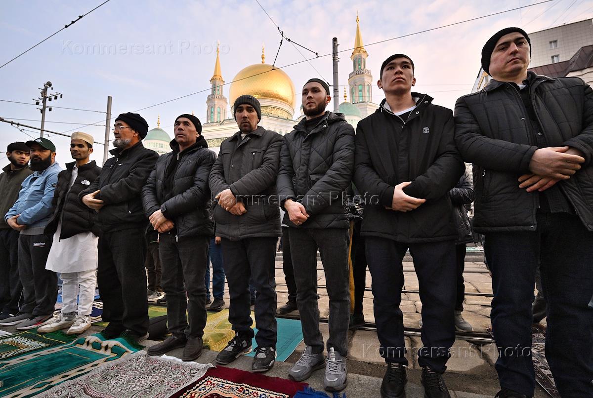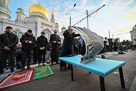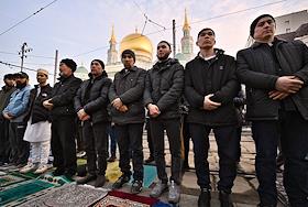 Праздничные мероприятия в день Ураза-Байрам. Мусульмане в Московской Соборной мечети.