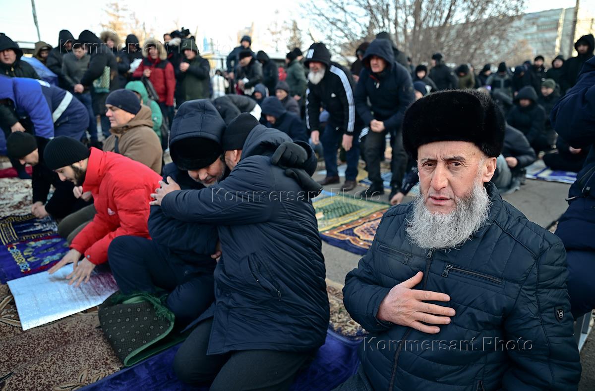 Праздничные мероприятия в день Ураза-Байрам. Жанровая фотография. Мусульмане во время молитвы на…