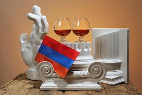 Жанровая фотография. Надпись "День коньяка" из кубиков и коньяк в бокалах среди гипсовых фигур.