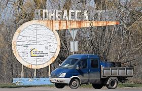 Жанровая фотография. Ситуация в зоне СВО. Въездная стела с надписью "Донбасс Актив". Автомобиль…